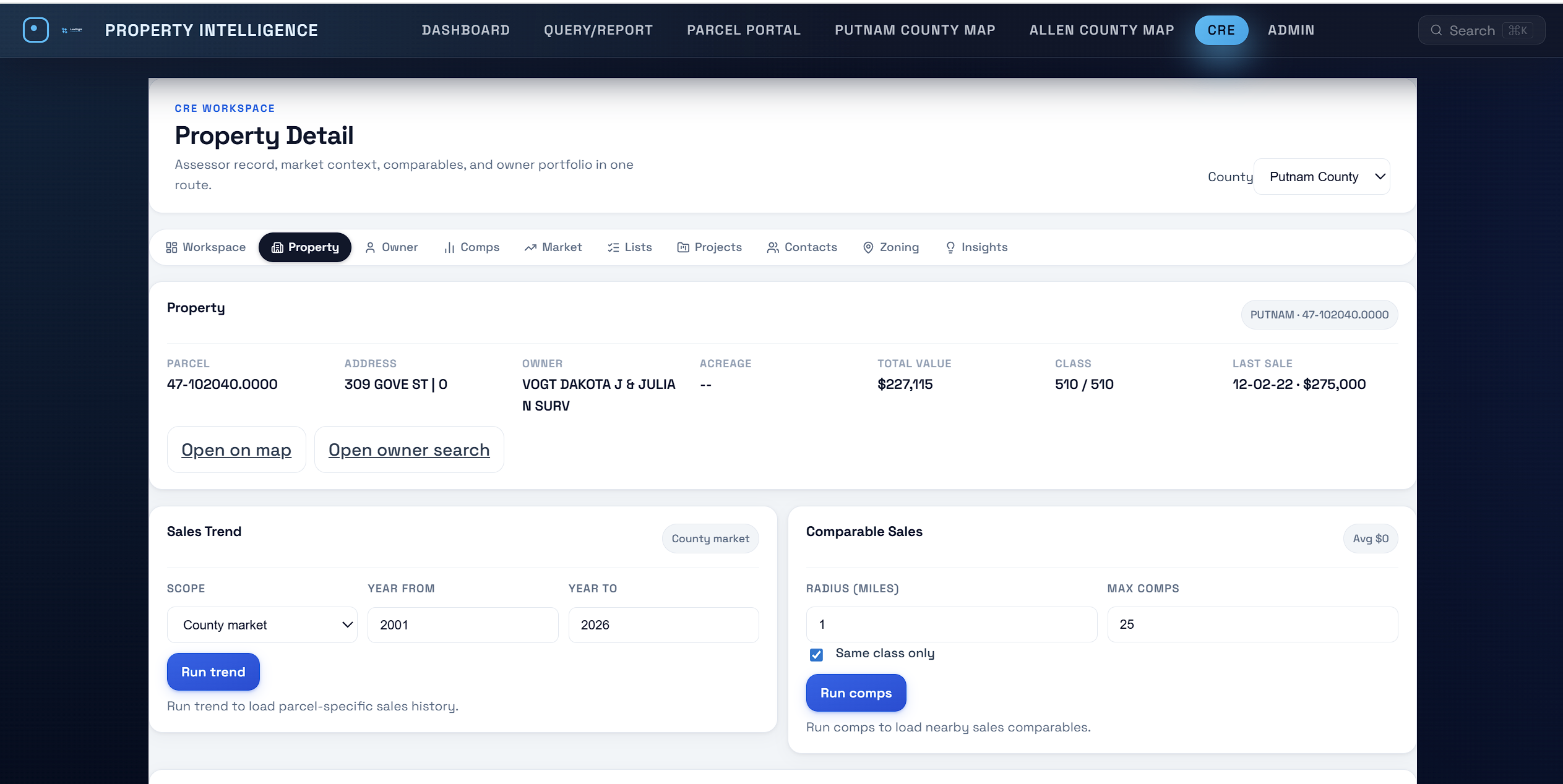 Present parcel intelligence with real map context: comps, ownership, zoning, and market trend visuals in one polished workflow built for CRE sales conversations.